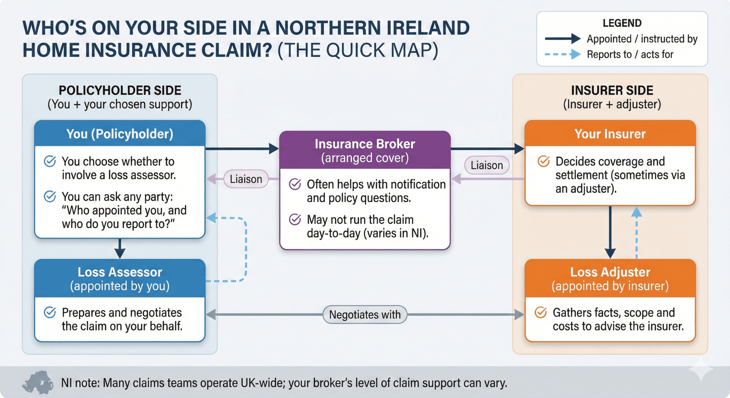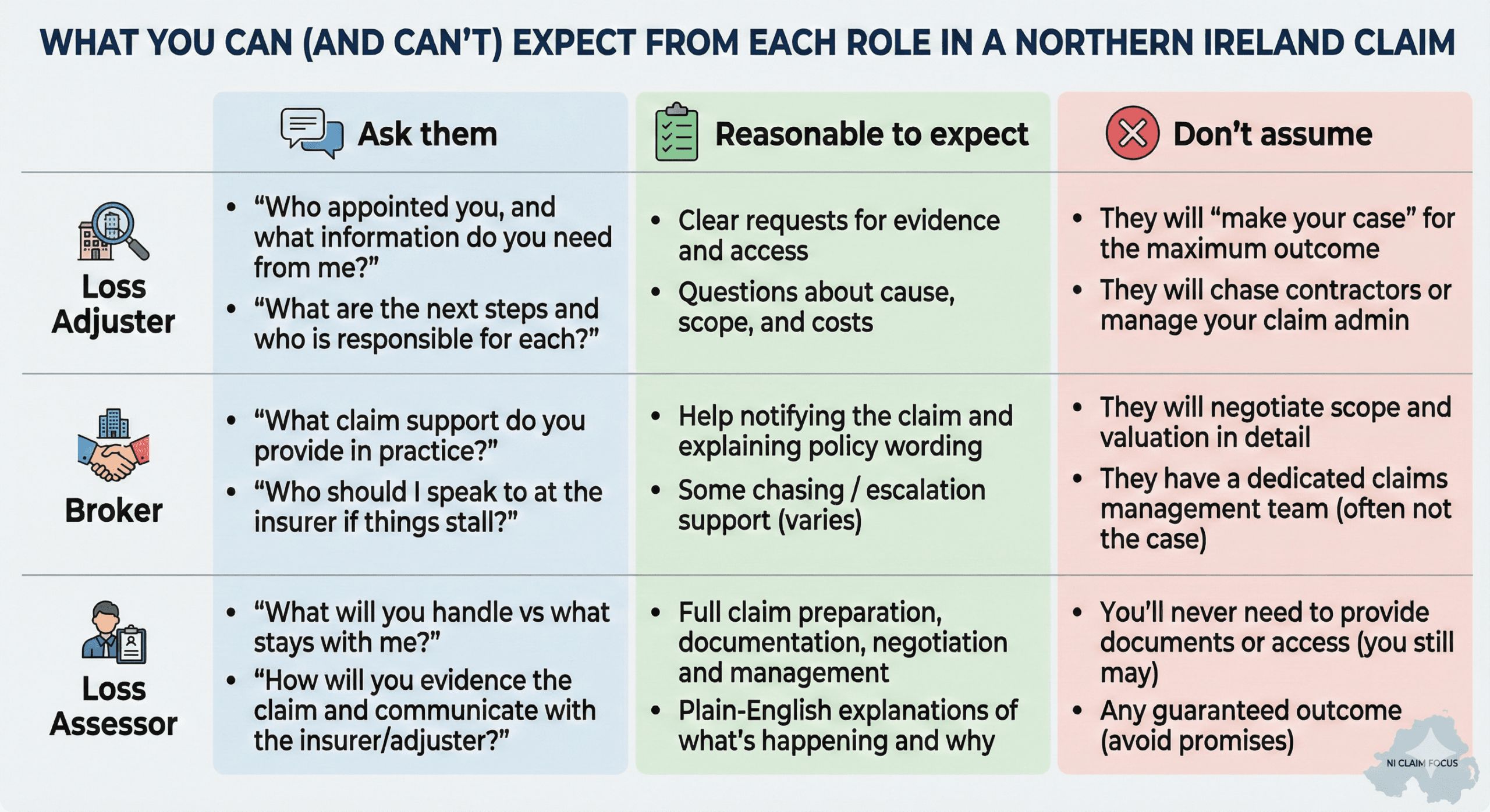 | Core job | Investigate, validate, scope, and recommend settlement | Arrange cover; explain the policy; may help you communicate with the insurer | Prepare, evidence, and negotiate the claim; manage the process for you |